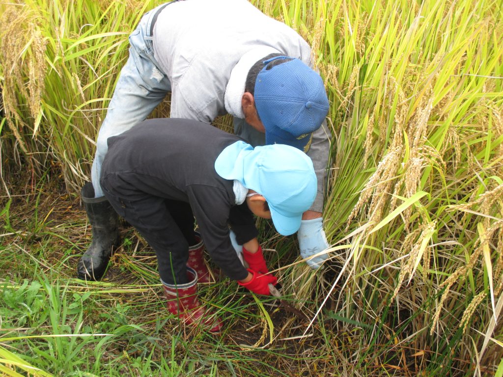 そして今日は稲刈り。手伝いに来てくれたおじいさんが、「春植えた稲がこんなに穂をつけて良かったね。」とおっしゃると、子ども達は自然に拍手!